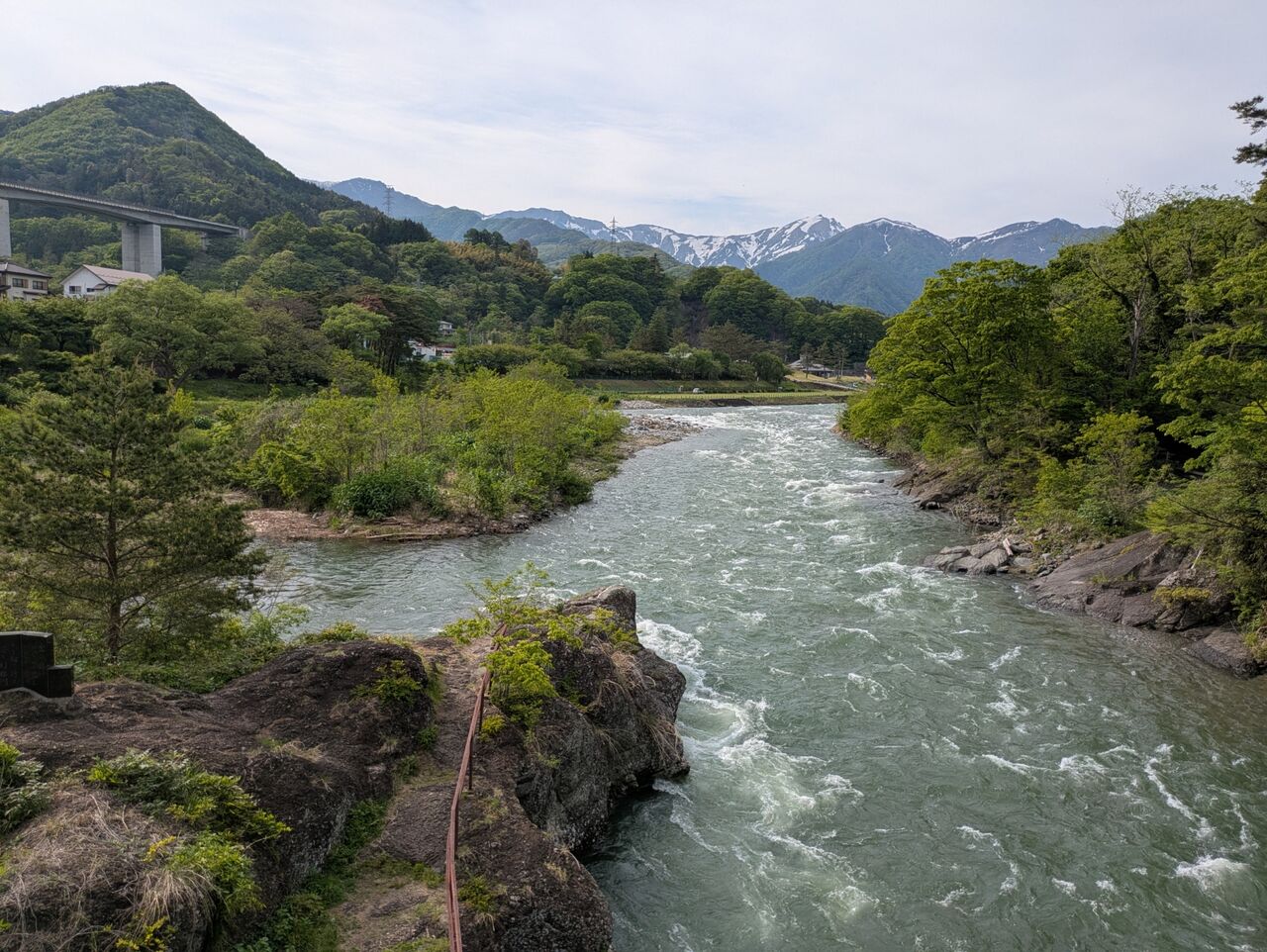 道の駅周辺の諏訪峡もユキシロで物凄い水量